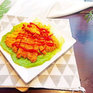 把鸡排正反两面都沾上面包糠。可以用手压一下,尽量多粘一点面包糠。