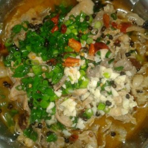把准备好的蒜末,葱花,辣椒段,花椒放在肉片上,热锅倒油,油有些微微冒烟时关火,泼在蒜末上。水煮肉片就做好了。