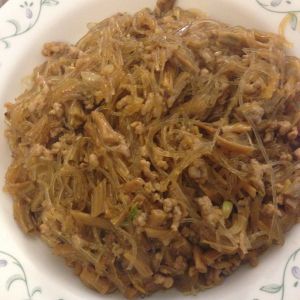 油热后放入葱花,然后放肉馅,炒熟放生抽,然后放黄花,炒一下放入粉丝可再加一些生抽,少加一点点水,收汁起锅!