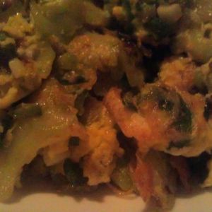 3.均匀倒入蛋液。煎黄翻面。(晚上光线暗拍好几次导致苦瓜有点过熟-_-||)