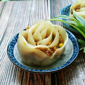 做好的玫瑰花饺子摆入蒸盘,送入蒸烤箱,调蒸功能,时间15分钟。