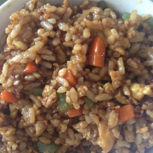 放少许油 把米饭炒散 加焯过的材料和鸡蛋 继续翻炒 炒开炒匀,放生抽和老抽 和鸡精 炒到每粒米都上色 出锅