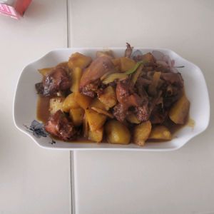 翻炒五分钟后加入土豆块,然后加盐,十三香,生抽耗油调味。加入清水(淹没鸡块),加入葱段,花椒八角