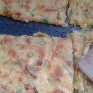 我是用的电饼档,加热放一点点油,然后把面糊倒入!也可以用炒锅煎,热锅冷油,小火,做到这几点基本上就不会粘锅了!