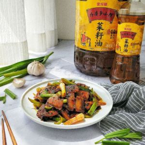 8、起锅倒入金龙鱼外婆乡小榨菜籽油。