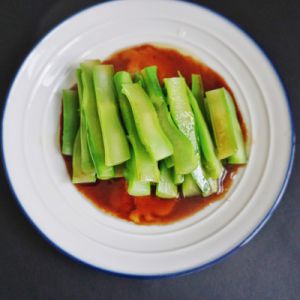 把沥干水的芥蓝摆盘,淋上刚煮好的酱汁