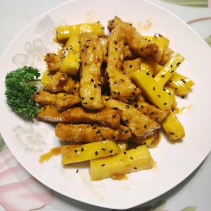 加入糖醋汁,下凤梨,中火翻炒上色!淋一点水淀粉,让糖醋汁均匀包裹住食材即可出锅!