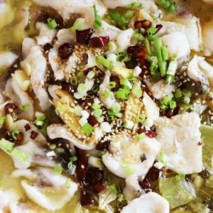 9.先把酸菜和鱼骨头捞出,汤留下,然后加入鱼片,煮开