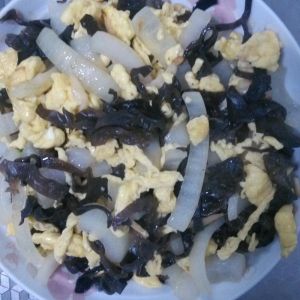 然后再少放底油,将蒜末炒香,放入洋葱丝,大约几分钟后放入木耳丝,翻炒几分钟后放入鸡蛋