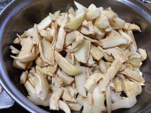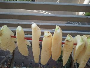如图,白萝卜对半剖开,用绳子串起来晾晒3-4天左右。(也可以摊在干净器物上晾晒,随大家怎么方便)