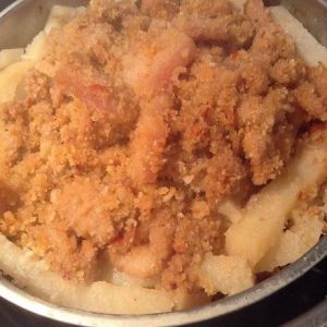 大米入锅翻炒,放入花椒,炒至黄白,有香味,如粉碎机粉碎,大概成鱼籽大小