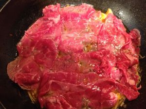先熄火,将室温解冻的肥牛片平铺在锅内。开火,加盖大火30秒关火,肉片未熟透的部分利用锅内余温搅拌即可。(此时口感最佳,肉片含丰富肉汁。怕拉肚子不放心的朋友尽可一锅乱炖,煮到放心为止。)