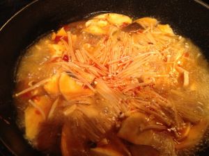 加入半锅开水,金针菇下锅,大火煮10分钟。(不加盖)