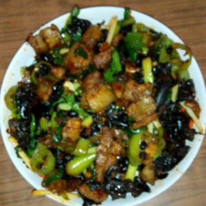 五花肉爆炒至打卷放入切好的青蒜,木耳,尖椒翻炒。