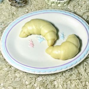 从大头开始卷,卷至尾部稍拉伸下,末端藏下面,牛角就卷好了!