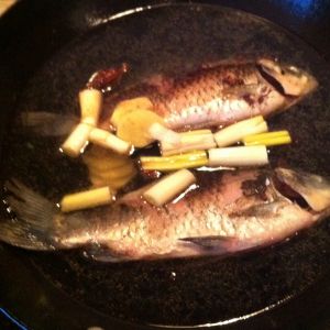 锅中放油,油热放入花椒,爆香后,放入鲫鱼。小火煎制。