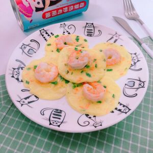 平底锅刷油、面糊摊成小圆饼,放好整颗虾,一同摊熟即可。