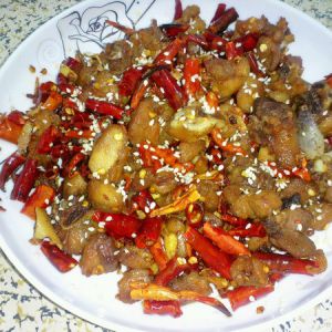 锅中留适量底油,放入蒜片,姜片,干辣椒和花椒,炒出麻辣香味后倒入炸好的鸡块。