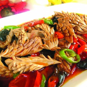 猪腰洗净后,对开,去掉白筋和暗红的腰臊,打上花刀后切片。