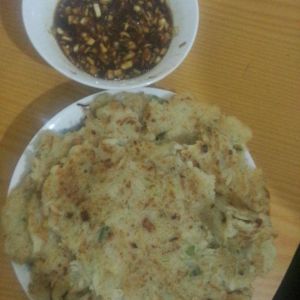 饼好啦!酥酥软软的。旁边是蘸料,自己随意搭配。我用的蒜,捣烂加水,生抽,香油和醋。