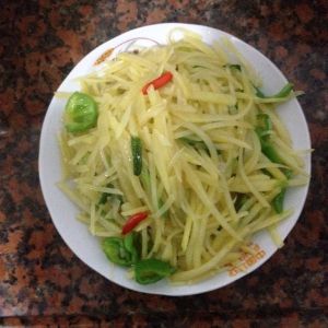 倒入油,等油温差不多时加入小米椒,在放入土豆翻炒,加盐,鸡精,翻炒,加少许醋,翻炒加入青辣椒,再加鲍鱼汁,翻炒,再加入生抽,翻炒,在加葱,这样就可以,记得这样,顺序,青辣椒才不会变色,炒出来绿绿的