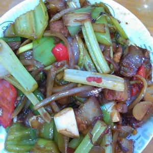 炒肉放酱油,再放放芹菜 青椒 等辅料,差不多就出锅。