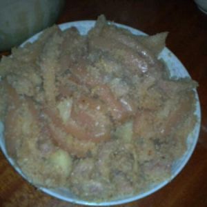 將肉.土豆塊加少許鹽.醬油.薑末.拌勻後再加入蒸肉米粉拌勻擺盤。