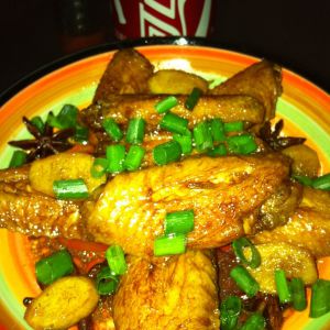 随后在倒入—可乐,八角,大葱,生姜,料酒,生抽,等辅料……煮至10分钏左右就可以出锅啦…………