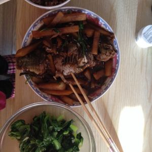 锅内剩油,加入花椒,大料,葱姜丝蒜片爆香,加入一碗凉水,水开后加入1勺生抽,1勺老抽,1勺醋,半勺甜面酱,1/3匙糖,放入鱼炖7分钟,汤汁收的差不多根据咸度放少许盐即可。最后撒上香菜,蒜片出锅。