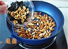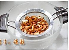 我觉得杏仁太咸,也放入水中冲洗了一下,一并沥干。如果是杏仁条省略此步骤。