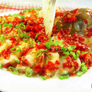 将鱼身略微抹上盐,料酒,然后撒上剁椒、姜末。
