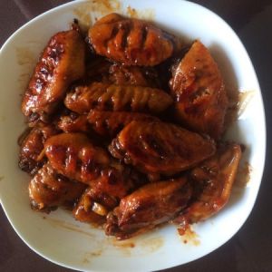 不粘锅中倒入少量橄榄油,下鸡翅煎至两面金黄。下蒜末煸香,立刻喷入少量酱油翻炒均匀,依口味加入适量美极鸡精(因为肉要入味所以鸡精没有放在最后加),白砂糖炒色调味,倒入没过鸡翅量的可乐开炖。