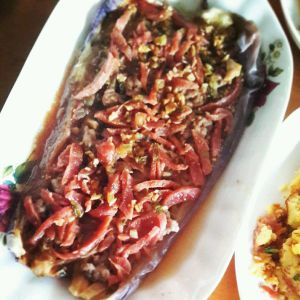 茄子去尾去頭,中間划一條線,放盤子,蓋保鮮膜。肉切沫,香腸切條。醬油加蔥花加蒜沫加一點油加自己想加的調料。