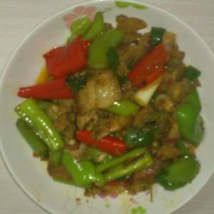 先用蒜蓉下锅后炒出味道来,然后放入出油后的五花肉及青蒜和青红椒,加入盐和豆瓣酱及老干妈快速翻炒直至配菜软了就可上锅喔!