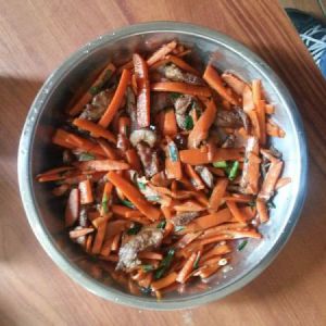 瘦肉切成肉丝,胡萝卜切成条状,放油热锅,倒入瘦肉小炒,加生抽,