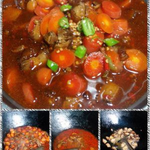 煎肉的时候,胡萝卜洗净,切小块,肥肉快煎干的时候,加胡萝卜,再继续翻炒,加豆瓣,继续炒。然后加水,淹过肉和胡萝卜。