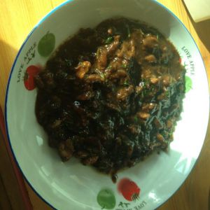 锅内放三勺油,烧热,先放胡椒粉,炸香,放黄豆酱,翻炒数下,下肉丝,翻炒,最后下蘑菇,继续翻炒,觉得干就放点水,呈干湿适中的状态就可以出锅了。