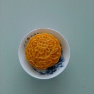 把面团分成大小均匀的团,在月饼模子里撒面粉防止粘连,将南瓜面团压扁