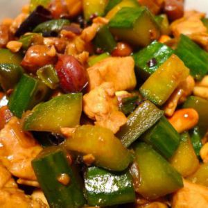黄瓜切段,花生预先炸一下。将味好美调料加水调匀。