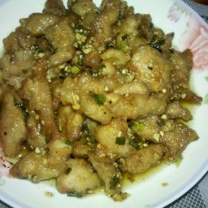 锅中放入少许油,倒入少许姜葱未炒香,再放入炸好的肉片,蒜末,香醋鸡精炒均盛盘即可。