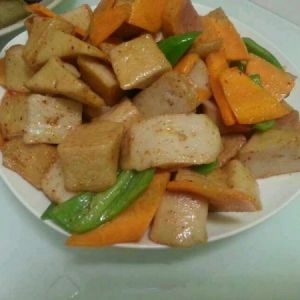 锅中倒油,油热放少许葱花,翻炒出香味放尖椒和红萝卜 ,翻炒几下放鱼豆腐(鱼豆腐很容易糊锅,一定要勤翻炒);