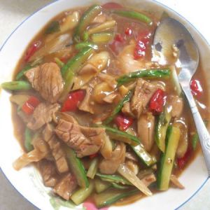 热锅凉油(要比平时炒菜油稍大些),放入泡椒,然后放人鲜姜片没有蒜苗的这个时候放入(大蒜),煸出香味后,放入腰花,蒜苗倒入红椒快速以大火爆炒