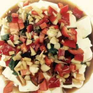 拿个盘子放上豆腐,在放上皮蛋,上面浇上调好的汁,就可以了