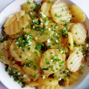 锅中放入食用油,油热后放入蒜末炒香,放入土豆片,小火慢煎。煎得差不多时了放入孜然粉炒匀。