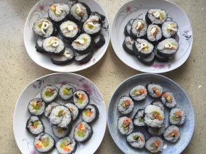 将大米和糯米洗净放入电饭煲中煮熟;黄瓜胡萝卜洗净去皮切长条,黄瓜可放一些细盐调味,火腿肠切条,腌萝卜超市买来就是长条的,可再切细点;拿两个鸡蛋打散,锅里倒油,将鸡蛋均匀倒入,两面翻炒,出锅切长条。