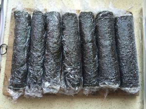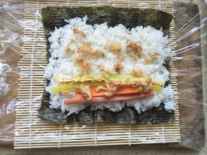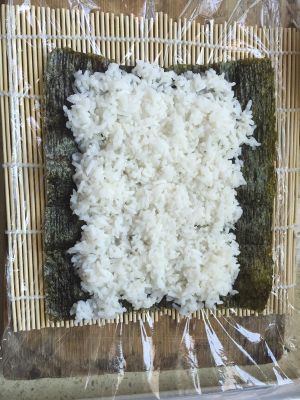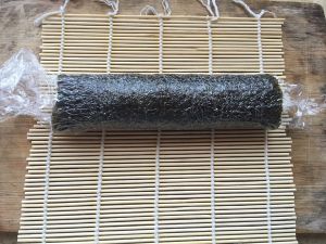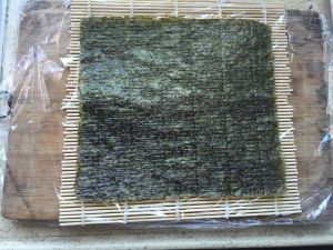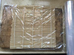 将卷帘放在砧板上,卷帘上可铺一层保鲜膜,这样更容易将寿司卷成条,方便固定成型。