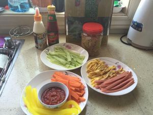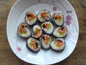 放上火腿肠,胡萝卜,黄瓜,腌萝卜条,撒点肉松