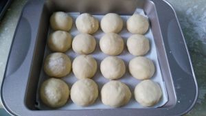 将每个小面团揉匀滚圆摆在烤盘上,空开距离,二次发酵。
