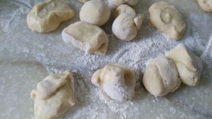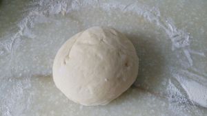 取出面团,撒干粉防粘,揉搓面团,排除空气。