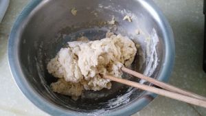 除橄榄油以外的所有材料放在盆中混合,搅拌成团无干粉。
